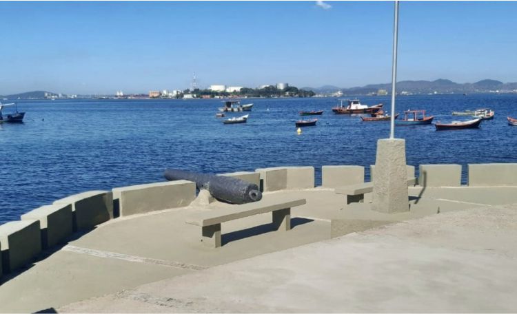 do piso em concreto com faixas de pedras portuguesas e da calçada próxima, a manutenção da pintura que protege o canhão e a recomposição dos guarda-corpos, construindo novos e reparando os remanescentes.